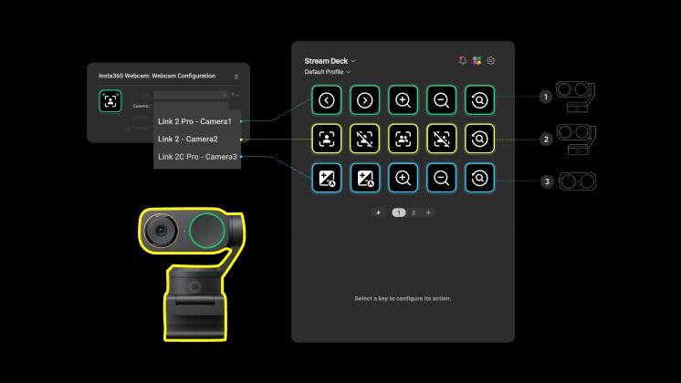 • Khác với các phần mềm webcam thông thường chỉ cho phép điều khiển từng camera một, Stream Deck giúp người dùng quản lý cùng lúc nhiều camera Insta360. Điều này cực kỳ hữu ích cho các buổi podcast, giảng dạy hoặc sản xuất video đa góc quay.