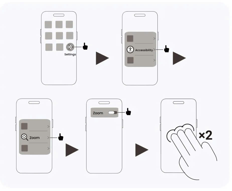 - Đi tới Cài đặt (Settings) > Trợ năng (Accessibility) > Thu phóng (Zoom) và bật tính năng này lên.